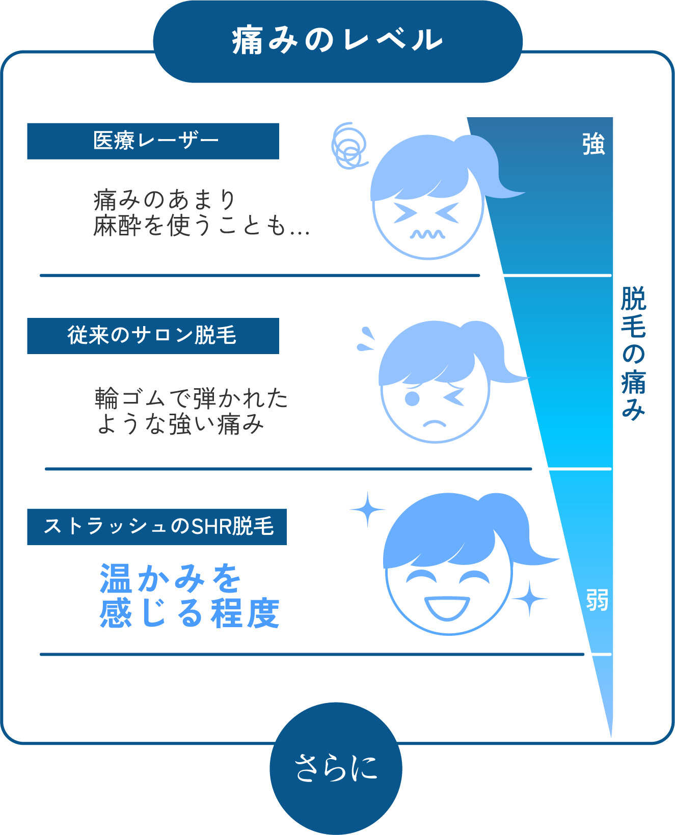 従来の脱毛方法と比較すると、肌に温かみを感じる程度で脱毛が出来ます。従来の施術方法が高温で光を照射するのに対し、ストラッシュのSHR脱毛は低温での連続照射のため、施術後の肌トラブルも防ぐことが出来ます。