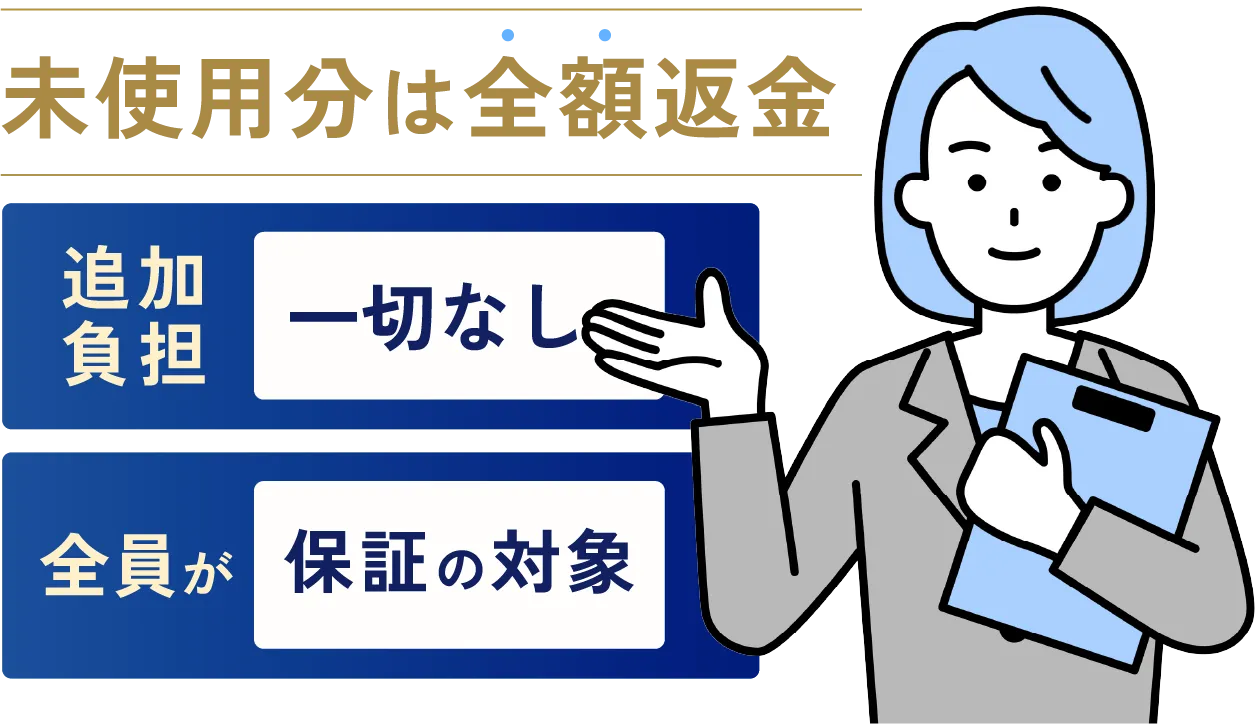 ※関連商品の代金、特典・付帯サービスに係る返還債務は含まないものとします。保証サービスの詳細は、エステ契約書の約款をご確認ください。