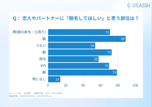 恋人やパートナーに脱毛してほしいと思うパーツは、脇や脚など日常的に気になりやすい部位のほか、自分ではなかなか自己処理が難しい部位も挙がっています。