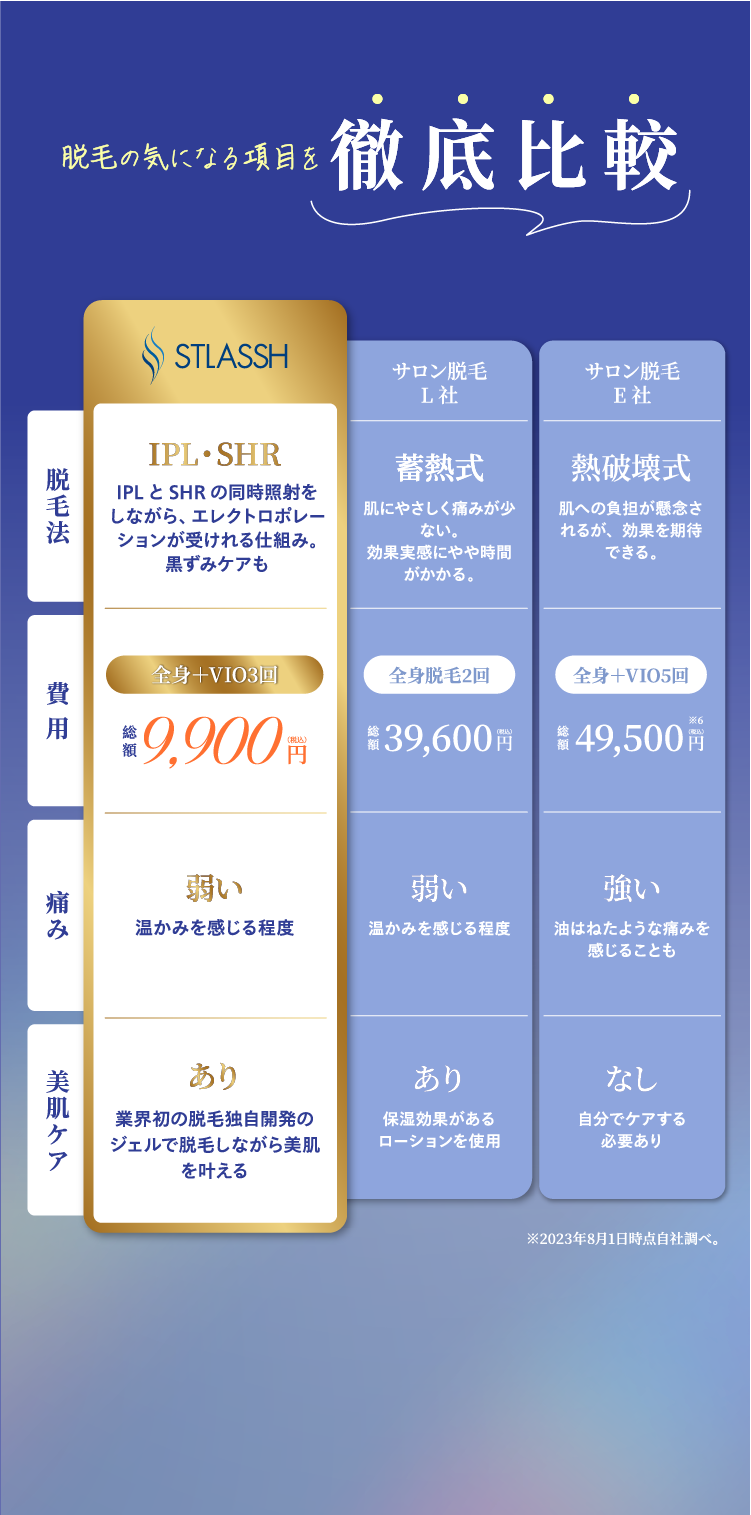 従来の脱毛方法と比較すると、肌に温かみを感じる程度で脱毛が出来ます。従来の施術方法が高温で光を照射するのに対し、ストラッシュのSHR脱毛は低温での連続照射のため、施術後の肌トラブルも防ぐことが出来ます。